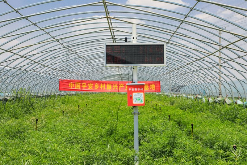 与轰隆的自动插苗拖拉机相比,一路之隔的智慧农业设备略显文静,它默默地把土壤、大气数据发送至农户手中的平安数字村,静候农户远程发出浇水与否的指令。