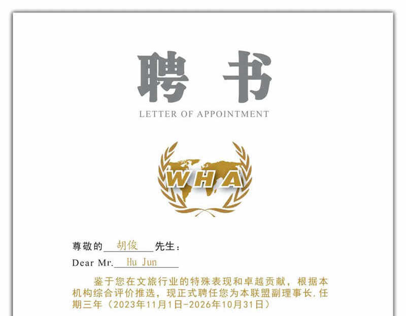 经研究决定,现聘胡俊担任联合国经社部世界酒店联盟副理事长,任期三年,特此公告。