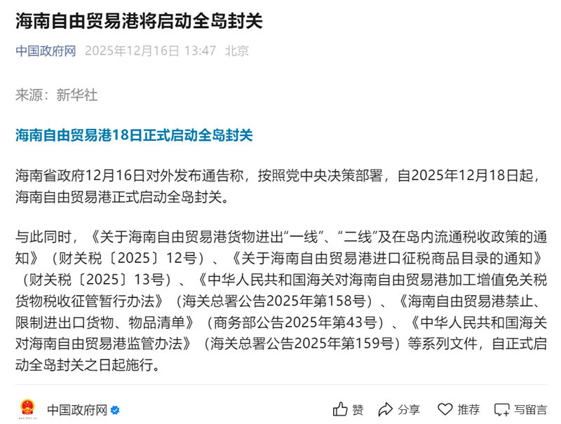 海南省政府12月16日对外发布通告称,按照党中央决策部署,自2025年12月18日起,海南自由贸易港正式启动全岛封关。
