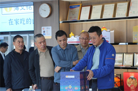 在随后的座谈交流中,欧于斌董事长向调研组系统汇报了海文铭在鲍鱼深加工领域的实践成果,并重点展示了公司各种鲍鱼相关的产品,带壳鲍鱼、纯肉鲍鱼、盐磨鲍鱼、黑松露鲍汁鲍鱼、鲍鱼捞面等等,特别是公司的明星产品——佛跳墙。他表示,海文铭作为福建省海洋食品产业的代表企业、省级农业产业化重点龙头企业,海文铭始终秉持“食品安全第一,品质至上”的经营理念,从原料源头严控产品质量,尤其重视与优质产区的战略合作。平潭身处在亚热带季风区,不但水温与盐度适宜,而且平潭作为国际旅游岛,岛上几乎没有工业污染,水质环境优越,拥有丰富的海藻资源,为鲍鱼提供了良好的生长环境。所以鲍鱼个头饱满、口感脆嫩、弹性佳。这些也正是海文铭始终选择平潭鲍鱼作为核心原料的原因。