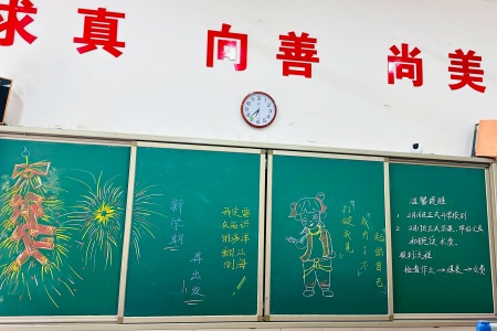老师们精心设计的黑板变成了一幅绚丽的画卷,那是对同学们新学期的美好期许,也承载着知识与梦想的力量,等待着同学们踏入教室时惊喜的目光。用心的老师们还挖掘当下的热播电影《哪吒2》的精神内涵,联系身边事例,听、唱鼓舞人心的歌曲等,在浓厚的氛围中,学生们深受感染,一个个鼓起了刻苦努力超越自我的勇气,呈现出奋发向上的精神面貌。带着对新学期的憧憬。