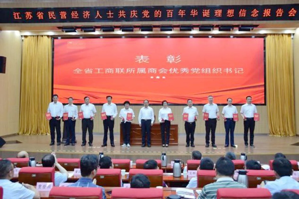 活动现场对全省工商联所属商会优秀党组织书记予以表彰,江苏省工商联党组成员、副主席、总商会党委书记陈京宣读《关于确定江苏省工商联所属商会优秀党组织书记的通报》,顾万峰为江苏省辽宁商会党支部书记彭小冬等30名优秀商会党组织书记颁发荣誉证书和奖杯。省工商联党组成员、副主席熊杰主持报告会。