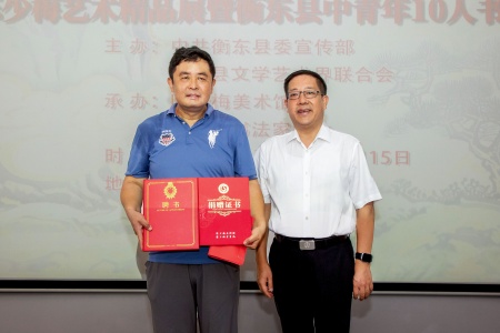 图:衡东县委副书记、县长蒋崇华出席活动并向陈少梅孙辈米川颁发收藏证书、陈少梅美术馆荣誉顾问证书。 杨波供图