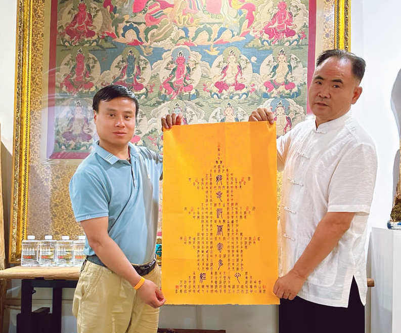图为:中经总网·中经在线特约通讯员邓禄平与书法家李明哲交流合影