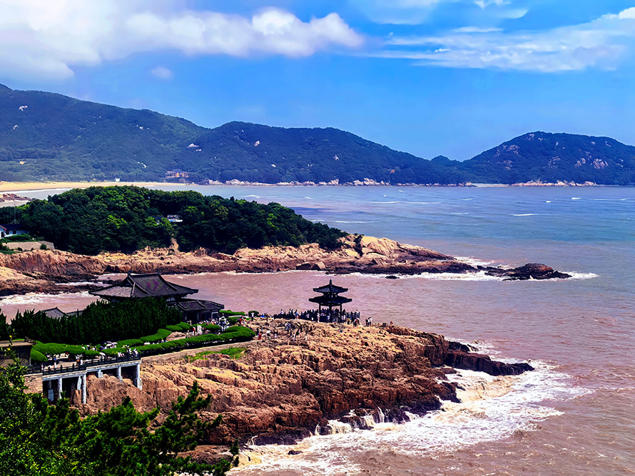 出法雨,未即下山,循声至千步沙。赤足踏浪,细沙温软如佛掌承托。潮来汐往,足印顷刻成痕,旋即又被抹平,恰似 “果上随缘” 的无声注脚。几个孩童嬉笑着追逐退去的浪花,拾取斑斓贝壳,清脆笑声与鸥鸟清鸣相和,是红尘烟火里最本真的欢喜。俯身掬起一枚空腔贝壳,贴耳倾听,仿佛能闻大海深处亘古的秘语,亦或是自身心湖的微澜。