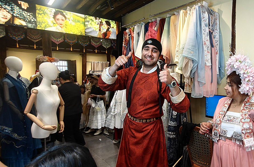 五月二日,随着一群外国友人——国际文旅推荐官的到来,花瑶旅拍馆瞬间变得热闹非凡。这些在义乌经商、从事外贸工作或是留学的外国朋友,在义乌外侨办工作人员的引领下,纷纷挑选起自己心仪的民族服饰。一位外国男士身着暗红色唐装,英姿飒爽,手持长剑,仿佛穿越时空,回到了那个文人墨客挥毫泼墨的时代;另一位则披上了黑白分明的藏袍,庄重而神秘,尽显藏文化的深邃与广博。六位外国美女更是成为了全场的焦点,她们或身着苗族盛装,头戴凤凰银饰,或换上华丽的汉服,头戴花冠,每一个转身,每一个微笑,都散发着无尽的魅力。