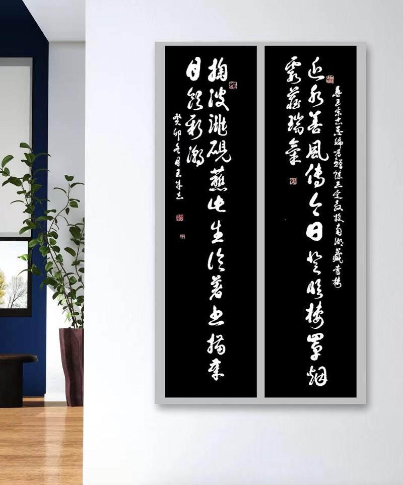 众所周知,从老祖宗发明甲骨象形文字开始,形,便成为了字的灵魂,以形塑意境,这是书法作品的一大特点。王成志将军在遵循继承这一特点时,也大胆融入了自己的想法,敢思,敢想更敢实践。比如他上联中的“烟”,右边的火字似熊熊燃烧的火焰,下面的零星碎笔,也似几簇星星点点的小火苗,在向上燃烧的过程中,逐渐加粗加重进而形成燎原之势。烟字右边的因与下面“霞”字上面的雨字头,又出现了字尽意连的奇观。王将军通过写意,将这二字的意境,通过近乎蒙太奇的手法,将云烟缭绕的飘渺,尽情地展现于读者,吸引着读者想更进一步的拨云雾而探其真。