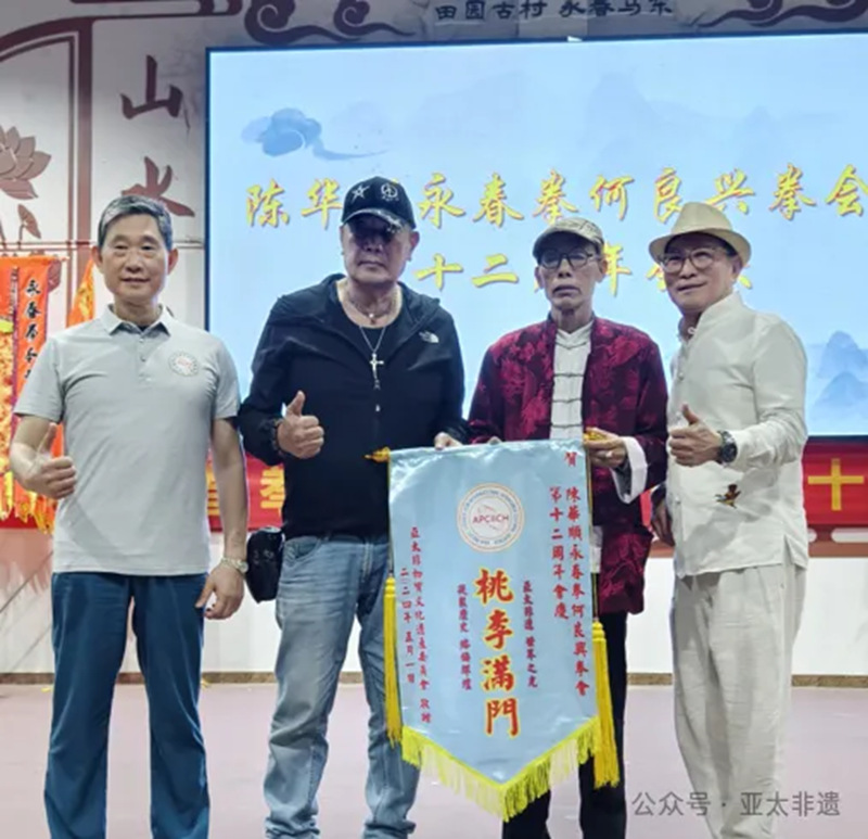 亚太非遗港澳分会主席王群博士(左一)、亚太非遗国际亲善大使国际影帝刘永大师(左二)代表亚太国际非物质文化遗产委员会向陈华顺永春拳何良兴拳会十二周年会庆赠送锦旗