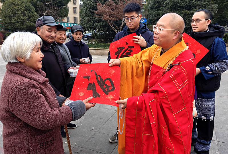 除了腊八粥,寺院还为大家准备了《福》字帖。这些字帖由浦江书法家亲笔手书,每一张都盖有金色的章子,共计2000份。它们不仅代表着寺院对大家的深深祝福,更是中华民族传统文化的传承与弘扬。市民们纷纷来到寺院领取字帖,他们的脸上洋溢着幸福的笑容,这份来自寺院的祝福让他们倍感温馨。