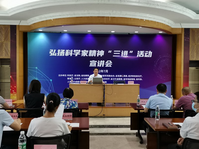 据悉,为深入学习国家关于科技创新重要精神,认真落实省第十二次党代会提出的“弘扬科学家精神,加强科学普及,培养创新创造文化,营造良好创新生态”要求,在全省科技界大力弘扬爱国、创新、求实、奉献、协同、育人的新时代科学家精神,积极营造良好科研生态和舆论氛围,从今年7月开始,由科技厅、省法院、省检察院、省委宣传部、省委军民融合办、省发展改革委、经济和信息化厅、教育厅、公安厅、人力资源社会保障厅、农业农村厅、省卫生健康委、省市场监管局、省科协、人民银行成都分行、中科院成都分院、省社科联等17家省级科研诚信联席会议成员单位组建“弘扬科学家精神”宣讲团,开展弘扬科学家精神进高校、进院所、进园区“三进”活动。本次宣讲会,是“三进”活动首场宣讲会。