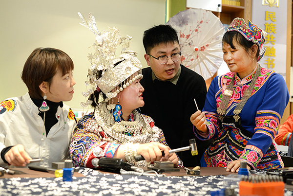 正所谓“无银无花,不成姑娘;有衣无银,不成盛装。”苗族银饰手工锻制技艺于2006年被列入国家非物质文化遗产保护名录。活动现场,身着苗族服饰的手工老师教授大家制作手工银戒,以苗族银饰历史为引导,从银饰图案的象征意义,到不同饰品的差别,引人入胜地讲解关于民族银制品的知识。一块块银条经过锻打、錾刻、焊接,清洗等流程后,精致又富有个人特色的银戒展现在每一位妇女手中。