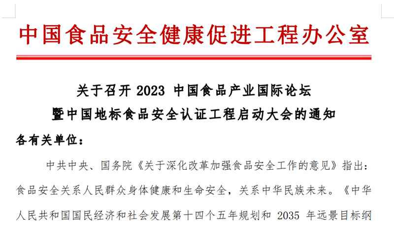 《关于召开2023中国食品产业国际论坛暨中国地标食品安全认证工程启动大会的通知》