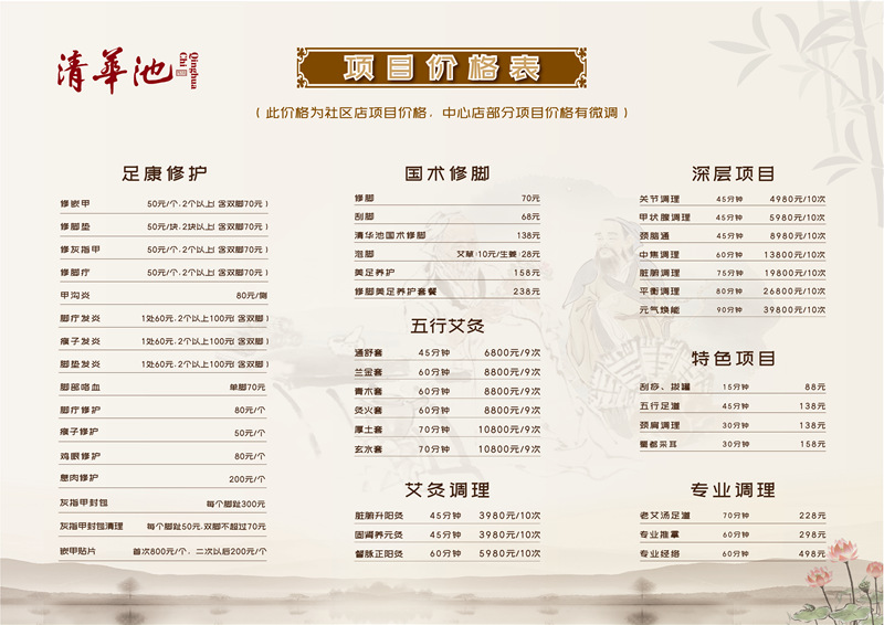 清华池始创于清朝末年1905年,从京城洗治业百年老店、脚病治疗中心到中医养生,清华池一直用匠心为客户提供专业、高品质的健康服务。清华池门店核心项目包括国术修脚、专业经络、古法艾灸等,清华池传统修脚术是国家级非物质文化遗产。