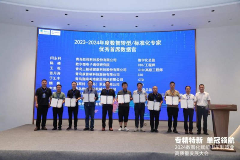 技术分享环节过后,大会进入了数字化转型/智能制造标准化专家发布及专家授聘仪式,来自青岛乾程科技股份有限公司数字化总监闫永利,歌尔微电子通信研究院CTO陈峰,青岛三柏硕健康科技股份有限公司CIO王乾,青岛康普顿科技股份有限公司CIO张月涛,青岛迦南美地家居用品有限公司CTO于汇丰,海斯特(青岛)泵业有限公司CIO隋巍,青岛世纪海佳机械有限公司信息总监李洪生,青岛环球集团有限公司技术中心主任高东明,海联金汇科技股份有限公司信息总监陈应光,青岛悠进电装有限公司信息总监陈化强,青岛三祥科技股份有限公司信息中心总监吴兰花,青岛益和电气集团股份有限公司CIO庄志岗,青岛依诺信工业自动化技术有限公司IT经理蒋世良,中信环境技术有限公司智慧水务总监兰灵,青岛睿智森油封有限公司综合部经理崔焕富,青岛华东葡萄酿酒有限公司信息主管李宏磊,山东华建铝业集团有限公司数字化中心总经理李海亭,青岛丰光精密机械股份有限公司IT经理吴伟圣,隔而固(青岛)振动控制有限公司 IT负责人马海东等30余位企业CIO和高管入选中国智能制造百人会匠心导师,并被中国机电一体化技术应用协会聘为第六批数字化转型/智能制造标准化专家。