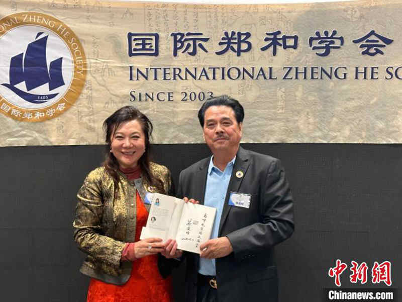 当地时间8月11日晚,澳大利亚澳中工商联合会与新加坡国际郑和学会在悉尼联合举办经贸合作与文化交流研讨会。研讨会上,新加坡国际郑和学会会长张露博士(左)将她的新书《丝路江心镜》赠予澳大利亚澳中工商联合会主席苏鑫峰(右)。记者顾时宏摄