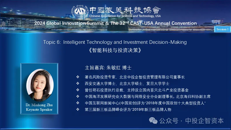中投企智资本董事长朱敏红受中国旅美科协邀请在2024全球科技创新高峰论坛做《智能科技与投资决策》演讲