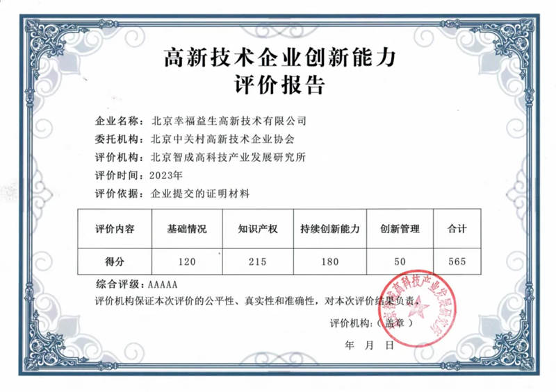 幸福益生获高新技术企业创新能力评价5A评级
