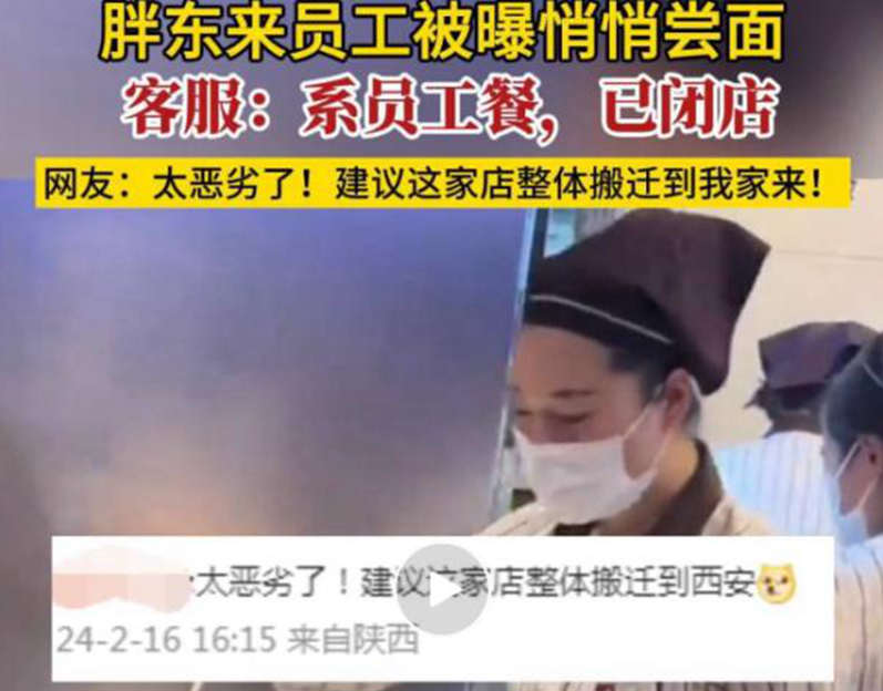 针对“员工尝面后未清洗筷子在锅里搅拌”一事,2月16日,河南许昌胖东来美食城工作人员回应称,2月14日中午顾客多,员工在前台做员工餐,但不允许,目前停业整改。