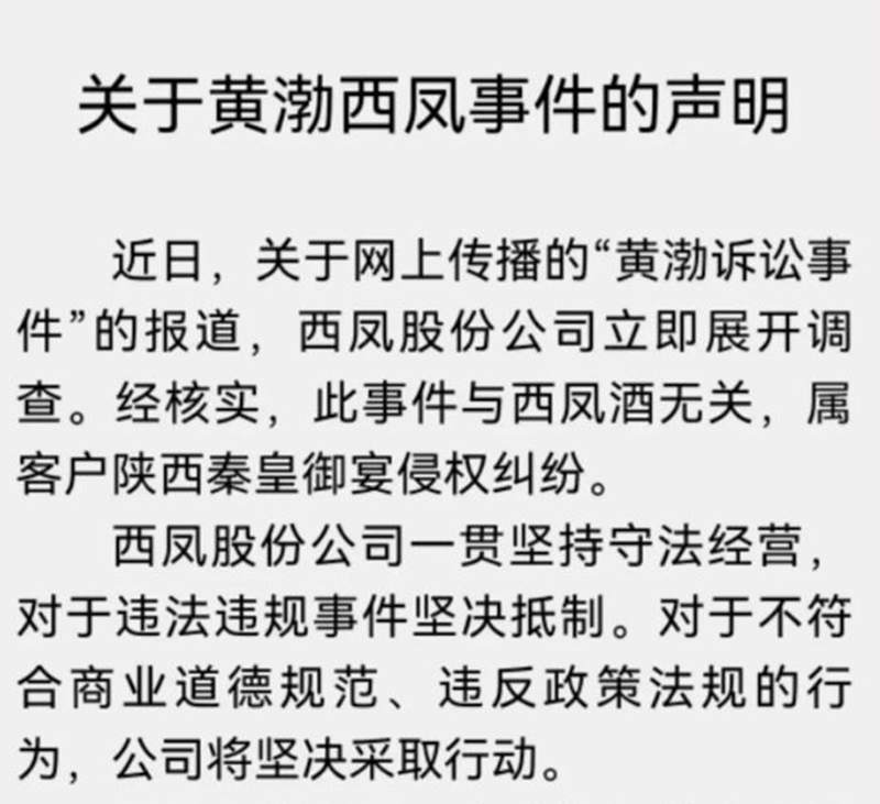 声明称:关于网上传播的“黄渤诉讼事件”的报道,西凤股份公司立即展开调查。经核实,此事件与西凤酒无关,属客户陕西秦皇御宴侵权纠纷。