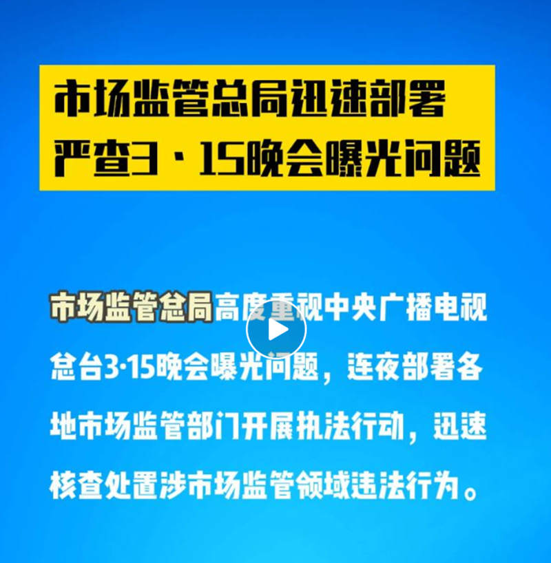 市场监管总局高度重视中央广播电视总台3·15晚会曝光问题,连夜部署各地市场监管部门开展执法行动,迅速核查处置涉市场监管领域违法行为。