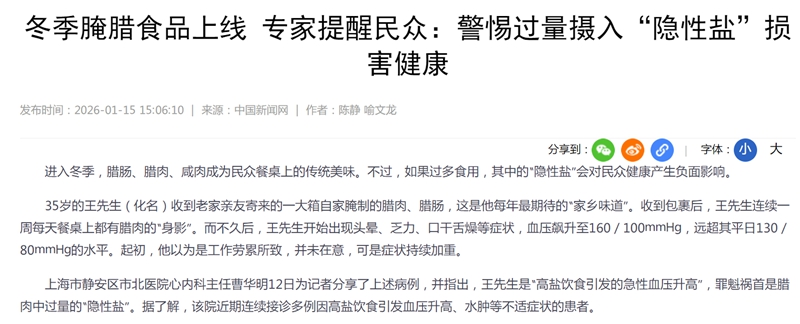 • 进入冬季,腊肠、腊肉、咸肉成为民众餐桌上的传统美味。不过,如果过多食用,其中的“隐性盐”会对民众健康产生负面影响。