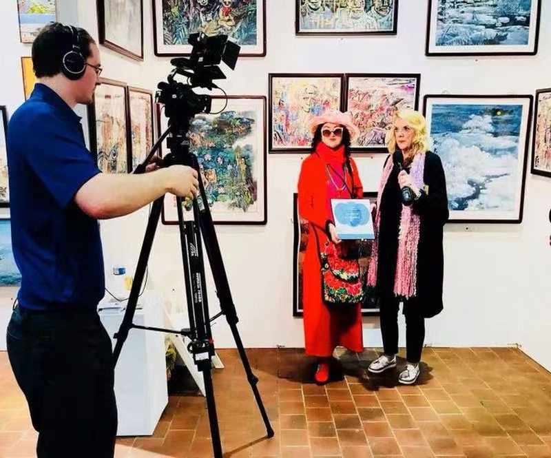 美国纽约国际艺术博览会女总裁现场电视采访,颁给陈艳梅女士杰出艺术家奖证书。