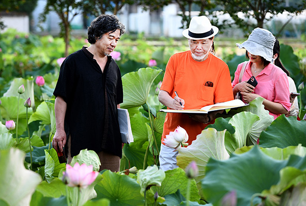 著名画家何水法、章龠中师徒俩,像那辛勤的蜜蜂,赶在炎热的太阳未登场之前,早早的来到荷塘采风写生。每年的这个季节,大师都会带着徒弟到这里采风或实地教学,足迹遍布田野。