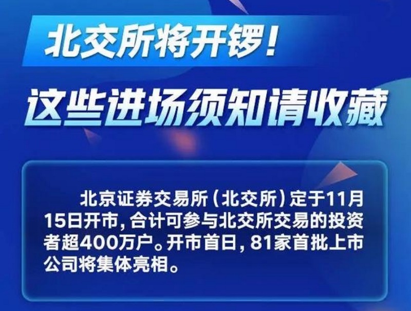 中国经济报道综合 北京证券交易所(北交所)定于11月15日开市,合计可参与北交所交易的投资者超400万户。开市首日,81家首批上市公司将集体亮相。