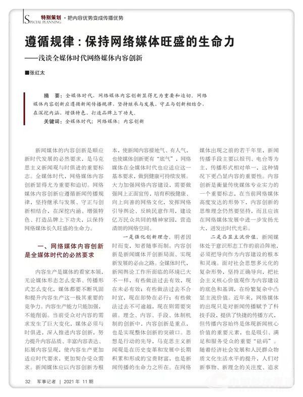 2021年第11期《军事记者》在“特别策划•把内容优势变成传播优势”专栏刊发了此文。文章指出,全媒体时代,网络媒体内容创新显得尤为重要和迫切,网络媒体内容创新应遵循新闻传播规律,坚持继承与发展、守正与创新相结合,在深挖内涵,增强特色,打造品质上下功夫,以保持网络媒体长久旺盛的生命力。