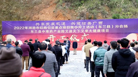 “共享发展机遇、共建壮美广西”。1月13日上午,东兰县艾草文化产业园艾通天下艾草大健康项目开工仪式在广西河池市东兰县隘洞镇纳乐村江平屯可怀坡举行。东兰县拔群干部学院常务副院长覃英学,县委常委、组织部部长韦宁,县人大常委会副主任韦坚,县人民政府副县长施扬泰,县人民政府副县长万晓云,县人民法院院长肖远忠,县农业农村局局长吴峻曼等领导出席本次开工仪式。同时参加的还有县文广体旅局、县退役军人局、县应急局、县审计局、县市场监管局、县统计局、县林业局、县乡村振兴局、县大数据发展局、县医保局、县投资促进局,隘洞镇党委、政府等单位领导及广西艾通天下药业科技有限公司总经理张子阳、副总经理韦丽华,隘洞镇干部群众代表30人。施扬泰主持开工仪式。