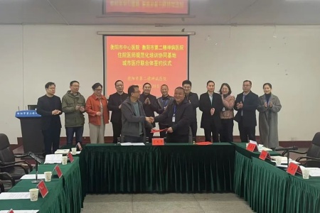 中经总网·中经在线湖南衡阳讯(张星兴 许杰 通讯员:邹柠璐)3月19日,衡阳市中心医院、衡阳市第二精神病医院住院医师规范化培训协同基地暨城市医疗联合体签约仪式在市第二精神病医院举行。衡阳市中心医院纪委书记洪卫国、副院长李远志,市民政局党组成员、副局长宁俊祺,社会事务科科长徐宁,市第二精神病医院党总支书记邓盛柞,院长戴辉及其他院领导出席,两院相关科室负责人及临床专家团队参加。
