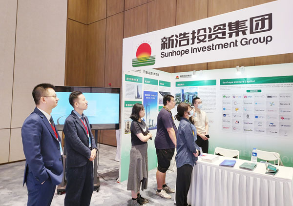 ▲与会嘉宾在新浩集团展台参观(申成勇/无人机拍摄)