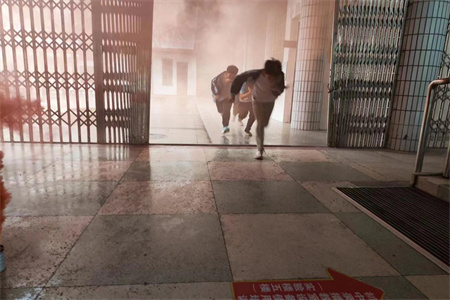 当天下午5点15分,学校教学楼2楼一间教室浓烟弥漫。紧接着,一阵急促的警报声在校园内响起,报警组学生处主任刘练第一时间拔打“119”报警,并迅速向校领导报告失火情况。现场总指挥校党总支书记邓立云当机立断,立即启动学校消防安全应急预案。副校长梁缓通过校园广播下达指令:“全体师生请注意,现在教学楼2楼一间教室发生火灾,请老师们立刻组织学生按计划、按要求、按路线有秩序的撤离,到运动场按升旗仪式队伍集合。”正在上课的师生们在定点引导疏散组人员的引导下,迅速列队,前后轻拽衣角,用湿毛巾捂住鼻口,低头躬腰,从相应出口有序右行下楼,飞速赶到操场,以升旗仪式的队形集合。班主任清点人数后层层向上汇报。5点21分,初一年级师生全部安全撤离。