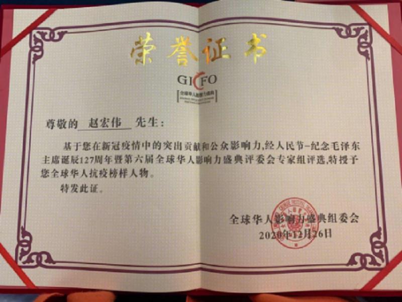 2021年5月,在第十届“行业领先品牌暨创新标杆企业宣传推介”活动中,中国沈阳陈氏正骨第七代传人、天宏骨业院长——赵宏伟凭借卓越的综合实力、品牌影响力以及正骨行业的领先优势,荣获中国民营科技实业家协会品牌管理工作员会联合授予的“中国正骨行业最具影响力领军人物”荣誉称号。这是对赵宏伟老师的鞭策和鼓励,也是赵宏伟老师继荣获“全球华人抗疫榜样人物”、“国医大健康成就大奖”两项荣誉之后所获又一殊荣和肯定。