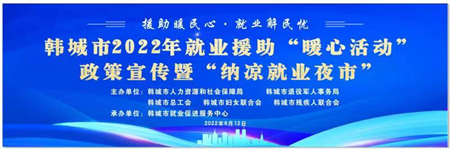 中经网讯 为深入推进陕西省就业援助“暖心活动”,集中优势力量为有就业意愿的人员送岗位、送服务、送政策、送温暖,帮扶稳定就业。8月12日晚7时,由市人社局、市退役军人事务局、市总工会、市妇联、市残联等部门联合主办,以“援助暖民心,就业解民忧”为主题的韩城市2022年就业援助“暖心活动”政策宣传暨“纳凉就业夜市”现场招聘会拉开帷幕。市政府副市长,市公安局党委书记、局长师正利出席启动仪式并致辞,市人社局、市退役军人事务局、市总工会、市妇联、市残联等负责人以及各镇办相关人员参加。