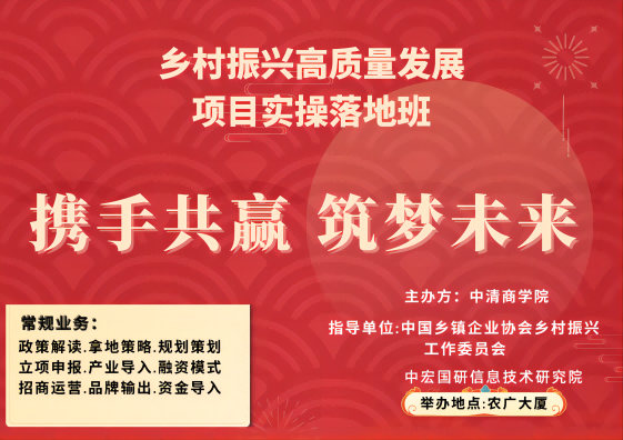 未来5年乡村振兴要投资7万亿,企业有哪些发展机遇?在参与乡村振兴过程中,您可能会面临以下一系列问题,需要专业指导和解答,涵盖政策、土地、资金、产业、定位、顶层设计、规划、知识产权、运营、品牌、营销和建设等方面。《乡村振兴高质量发展项目实操落地班》将为各界人士提供宝贵机会,将与乡村振兴领域的权威专家一对一深入探讨这些关键议题。通过政策解读、案例分享、专业知识传授和实践指导,将获得全方位的专业支持,助力您在乡村振兴项目中取得成功。