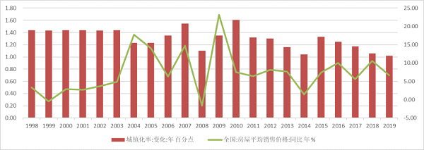 图1 中国新房价格指数与城镇化率逐年变化