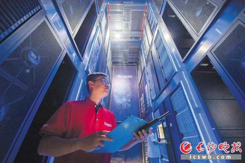 在湖南湘江新区的世界计算·长沙智谷,长沙市人工智能创新中心的工作人员在对服务器进行调试。该中心为湖南省目前AI算力规模最大的公共平台。