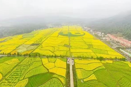 作为2023湖南油菜花节11个分会场之一,衡阳县库宗桥镇华山村村民不仅利用小麦、黄色和紫色油菜花,勾画出一个直径达236米的“五彩太极图”,以及“2023湖南省第四届油菜花节”巨幅字形图案,并创新种出了80亩巨幅卡通蜜蜂图案、50亩油菜迷宫图等景观。登上金华山巅,远眺山谷间的连片长条形油菜花海,宛若一幅醉人的江南山水田园画,“五彩太极图”、卡通蜜蜂图案、油菜迷宫图及“2023湖南省第四届油菜花节”几个大字清晰可见,令人赏心悦目。