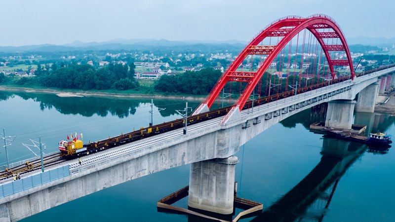 中经网特别报道 7月18日,国家重点工程,常益长高铁铺轨成功通过由中铁五局承建的常益长高铁全线控制性工程——资水特大桥,为常益长高铁建设早日通车运营奠定坚实基础。