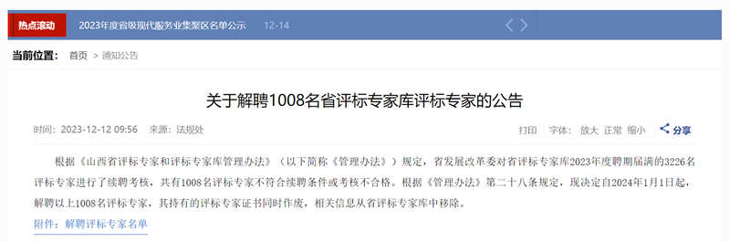 12月12日,山西省发改委发布公告,根据《山西省评标专家和评标专家库管理办法》(简称《管理办法》)规定,有1008名评标专家不符合续聘条件或考核不合格,自2024年1月1日起,予以解聘。
