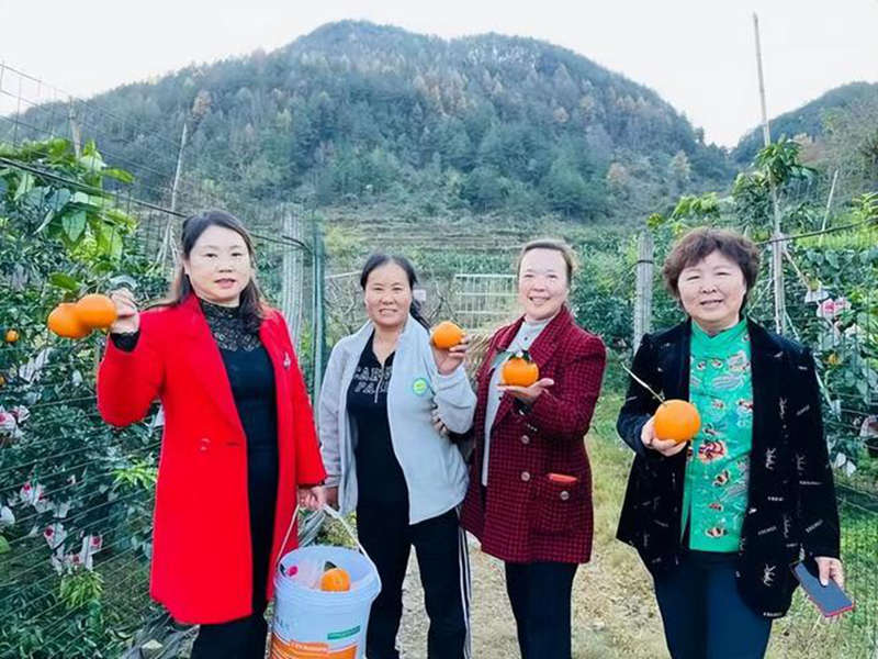 ▲秀山美其水果专业合作社主要成员(左二)和热心公益事业的洪安镇三不管岛度假酒店总经理陈建蓉(左三)展示刚从背后果园里摘下的“边橙缘”牌爱媛38号“果冻橙”。