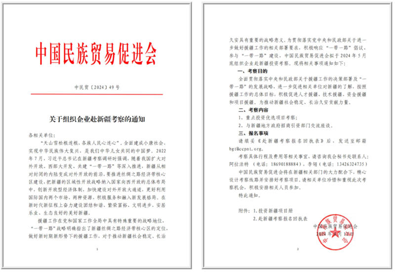 为贯彻落实党中央和民政部关于进一步做好援疆工作的相关部署要求,积极响应“一带一路”倡议、参与“一带一路”建设,中国民族贸易促进会拟于2024年5月底组织企业赴新疆投资考察。