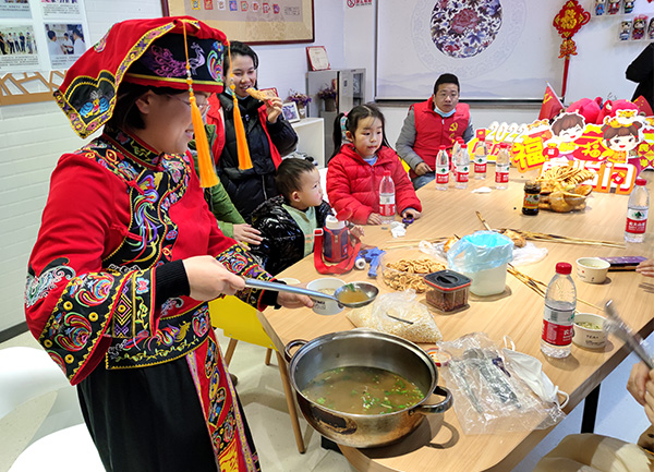 随着油茶的酥香扑鼻而来,是来自仫佬族的韦琳母亲在社区亲手制作家乡美食特产——“油茶”,一碗碗新鲜煮好的油茶,茶香满屋、滋味丰富。来自瑶族、布依族和维吾尔族的少数民族伙伴们也来到了社区,红领青年将油茶单独分装成8份,与大家一同分享年味。油茶的微涩在唇齿间翩跹舞动,茶香四溢。