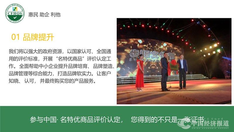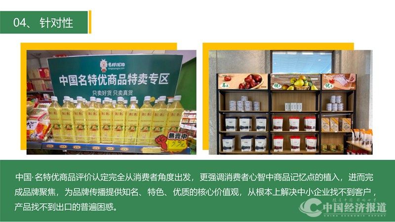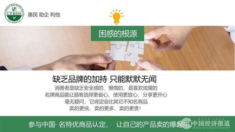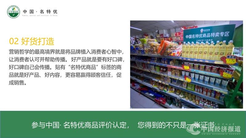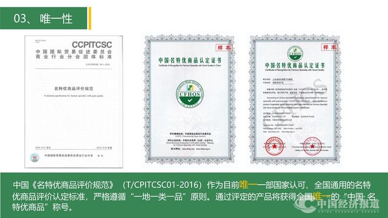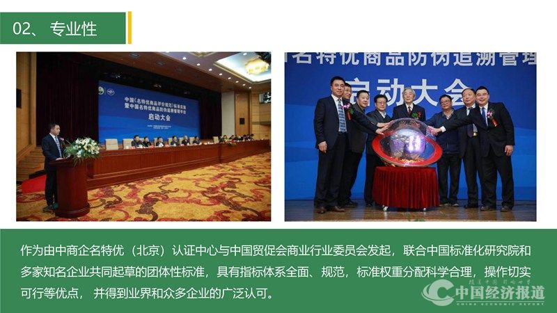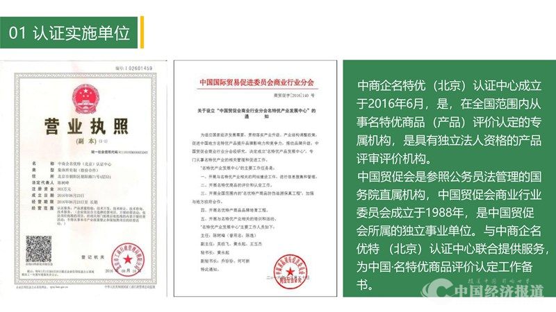 《中国经济报道》网携手中国贸促会商业行业委员会名特优产业发展中心、中商企名优特(北京)认证中心——中国名特优商品认定目的旨在扬优除劣、去伪存真,净化市场、造福于民,弘扬民族特色,为创新产业、拉动特色经济发展注入新力量,做出新贡献。