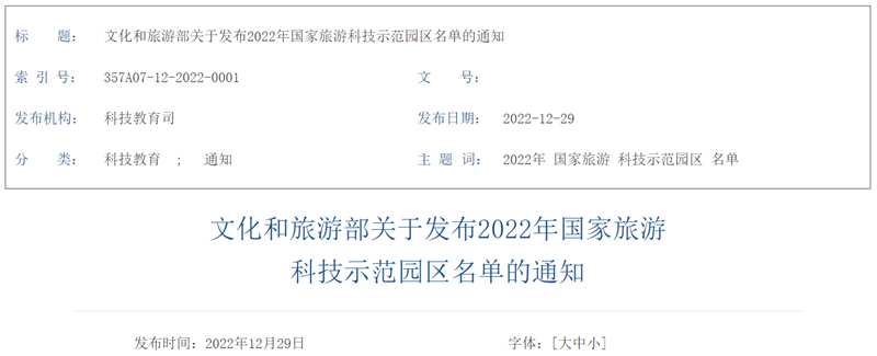 文化和旅游部:2022年国家旅游科技示范园区名单公示 12家单位入选