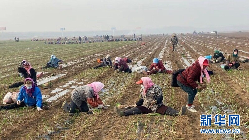 在海城市望台镇瑞亚蔬菜合作社圆葱生产基地,近300名村民正栽植圆葱苗。据悉,1100万株红博、托塔娜等品种的圆葱苗子计划4月15日前后栽植完成。