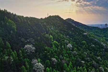 山峰上丛林茂密,随处都可以看见盛开的桐树花,一簇簇白色的桐树花点缀在郁郁葱葱的山林中,将整个山峰装点得如同一块花毯。乍一看,又像是一层淡淡的雪花,花海蔓延,营造出一片美丽而祥和的景象。