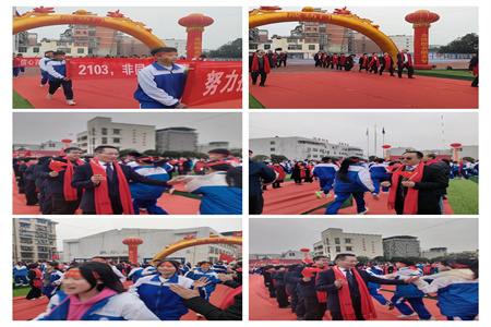 当激昂的音乐声响起,首先入场的是初三、初二各班横幅队,展现了孩子们迎接中考的决心、挑战中考的毅力。书记肖茂哲、校长刘家彪率初三、初二年级教师给同学们击掌鼓劲,热情迎接同学们跨过“成功门”。初一年级学子分立红地毯两侧,为学长、学姐呐喊助威。