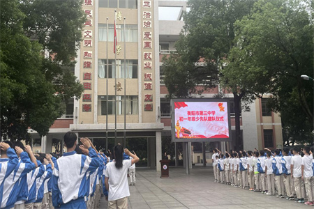 中经总网·中经在线湖南衡阳(张星兴 通讯员:刘力 刘华)为贯彻落实习近平总书记关于少年儿童和少先队工作的重要论述,引导广大少先队员传承红色基因,2024年6月3日上午,衡阳市第三中学隆重举行“学习新思想 争做好队员”2024年初一年级少年先锋队建队仪式。
